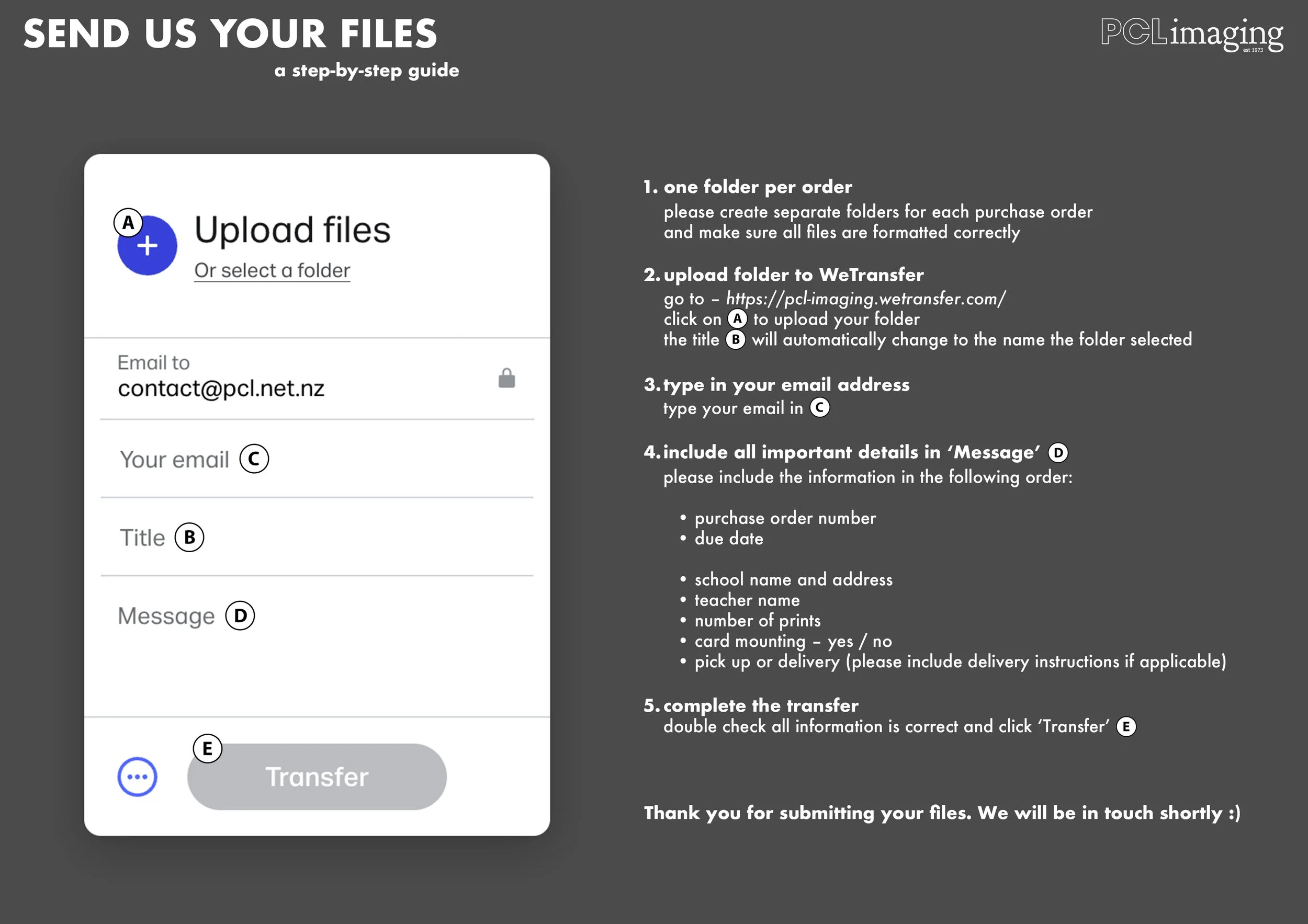 Send us your files - Upload the completed order form and your image files to our WeTransfer link. This link is located at the bottom of this page.